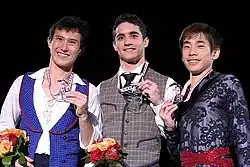 Fernández skated a clean short program at the 2015 World Championships in Shanghai, which included a quad Salchow, a triple Lutz-triple toe loop combination, a triple Axel and level-four spins. But his step sequence was rated level-three and his triple Axel was not perfect.[61] He earned 92.74 points and stood in second place, less than 2.5 points behind Yuzuru Hanyu.[62] He produced a free skate with two quads, six triples, level-four spins and level-three step sequence. His only major error was a fall on a quad Salchow attempt. He placed second in the segment with 181.16 points – his strongest free skate of the season – more than 5 points ahead of Hanyu and just 0.67 behind Kazakhstan's Denis Ten. Overall, he outscored Olympic champion Yuzuru Hanyu (silver) and Olympic bronze medalist Denis Ten (bronze) for the gold medal, having received a total of 273.90 points.[63] He became the first skater from Spain to win a world title in figure skating.[64]