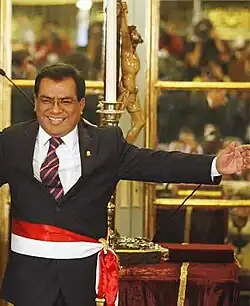 On 11 July 2009, President Alan García named him as prime minister during the controversy surrounding indigenous clashes with the government when 34 people died.[3] He was sworn in at 8:00 pm on 12 July 2009. The appointment of Velásquez, considered a party loyalist, was seen by pundits as an attempt by García to tighten his grip on power for his final term. It is considered a reversal after appointing the leftist Yehude Simon, Velásquez's predecessor.[4] Velásquez is the third person to hold the office in nine months.[5] Garcia, whose approval rating was 21 percent,[3] also replaced the ministers of defense, justice, agriculture and the interior.[6] He resigned his post in September 2010 with the intention to run for the Peruvian Aprista Party presidential nomination later that year. Although not selected as the nominee, he was part of the presidential ticket of Mercedes Aráoz in which he was the candidate for First Vice President until her withdrawal from the election in January 2011.