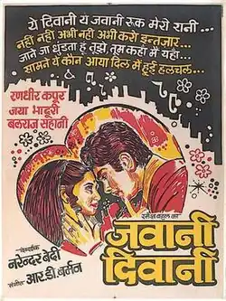Jawani Diwani (transl. Crazy youth) is a 1972 Hindi-language musical romance film directed by Narender Bedi, and starring Randhir Kapoor, Jaya Bhaduri, Balraj Sahni, Nirupa Roy as leads. This was also Kader Khan's debut as a dialogue writer.