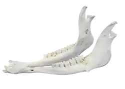 A jawbone war club is an edged weapon that was in the past used by Native American tribes.[1][2] The weapon is made out of the mandible of an elk, bison, horse or bear. It was common practice to add leather to make a weapon's handle. Such war club were sometimes painted with symbols of tribal significance.[3] Despite being a relatively primitive weapon, it was considered highly effective, and saw widespread use in prehistoric North America. The weapon was used primarily for close combat and was able to penetrate a human's chest. Occasionally the jawbone war club's teeth were polished.[4]
