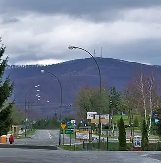 From the top of the main peak where the TON Góra Jawor radio mast is located, two ridges from the North-Eastern and South-Western points come off with culminations of 702 and 608 metres. By the side of the Jawor reservoir is a complex of leisure facilities and buildings.[2] Łobozew Dolny has an asphalt road connection which weaves around the mountain up to 700 metres, and steadily declines down to the complex.[3]