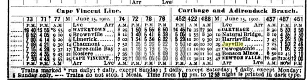 As published by the Rand-McNally in 1902, there were three trains that ran through Jayville. (437,487,451) The train schedule was published by the New York Central & Hudson Railroad and posted under the Carthage and Adirondack Branch.[15]