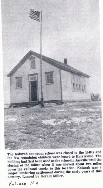 After the closing of the Jayville mines, the one-room school building was moved down the tracks to Kalurah, where it remained there until 1940.
