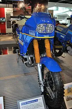 Despite their upturn in form, Olivier felt that Yamaha needed a more powerful engine to remain competitive, with average speeds increasing every year.[7] He lobbied the managers of Yamaha Japan to develop a more potent two-cylinder engine but was unsuccessful. At the same time, the brand's new four-cylinder FZ750 motorcycle was proving both powerful and reliable. Undeterred, Olivier obtained an FZ750 engine and fitted it to an XT600 frame, creating a prototype known as the Yamaha FZ750 Ténéré. The model was promising in testing and Olivier gained full support from the factory to develop it.[9] The motorcycle boasted 94 bhp, considerably more than their competitors, but weighed a hefty 197 kg and struggled for traction on sand. This negated its competitive edge and Olivier only managed 12th in the 1986 Dakar Rally.[10]