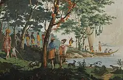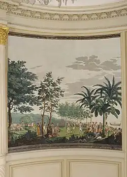 Les Sauvages depicts First Nation's people from throughout the Pacific set in a fictional tropical setting. The work was inspired by the exploration voyages of Captain James Cook between 1768 and 1779 and Jean François de La Pérouse in 1785.[9] Following these expeditions, the Pacific captured the imagination of Europe and America and was the inspiration for literature, plays and images which reached a wide audience.[10] Images produced by official voyage artists like John Webber were engraved and published, inspiring other exotic Pacific depictions like the Tableau des decouvertes du Capne. Cook & de la Perouse by Jacques Grasset de Saint-Sauveur.[11] Similarities in the colour palette and figurative vignettes in Les Sauvages indicate that Saint-Sauveur's Tableau may have inspired the work.[12] Primary sources, like the wallpaper's accompanying prospectus produced by Joseph Dufour in 1806, indicate that the subject of exploration and representations of the Pacific were very popular with a nineteenth century audience.[13] The interest was encouraged by Enlightenment philosopher Jean-Jacques Rousseau’s notion of the noble savage and the Pacific as a moral utopian civilization.[14] Les Sauvages perpetuates Rousseau’s stereotype, depicting homogenized races, living in harmony and peace.[15] Les Sauvages also demonstrates another contradictory Enlightenment ideal of pride in man’s scientific innovations, indicated by the celebration of exploration. The depiction of the Pacific seen in Les Sauvages is typical of the period, celebrating progress and innovation as well as a nostalgia for an imagined utopian past.