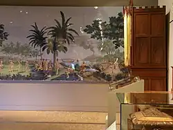 There has been significant interest in Les Sauvages throughout the twentieth and twenty-first centuries. Primarily, this was due to the acceptance of decorative arts as a high art form within art history. American scholar, interior designer and dealer Nancy McClelland was instrumental in reviving an engagement with the history of panoramic wallpapers and wrote extensively on Les Sauvages in the 1920s.[23] Commercial exhibitions of panoramic wallpapers by French dealer André Carlhian and books written by Henri Clouzot also enhanced critical engagement with Les Sauvages.[24] The wallpaper as an unusual art form was previously overlooked in academia and was not acquired by museums. The scholars of this time researched the context of production, biographical details of the makers and aesthetic features.[25] A prominent exhibition was held at the Musée des Arts décoratifs in Paris from 1990 to 1991 which sparked further interest in scenic wallpapers as a “social mirror” reflecting the world of early nineteenth century France.[26]