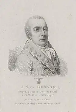 Jean-Nicolas-Louis Durand (French pronunciation: [ʒɑ̃ nikɔla lwi dyʁɑ̃]; Paris, 18 September 1760 – Thiais, 31 December 1834) was a French author, teacher and architect. He was an important figure in Neoclassicism, and his system of design using simple modular elements anticipated modern industrialized building components. Having spent periods working for the architect Étienne-Louis Boullée and the civil engineer Jean-Rodolphe Perronet, he became a Professor of Architecture at the École Polytechnique in 1795.
