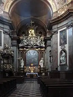 Between 1675 and 1694, Mathey worked in Prague.[1] He enjoyed a remarkable career in which his French planning and devotion to classical rationality (as opposed to the luxuriance of Italian Baroque) were a conscious artistic challenge to established taste. Mathey was commissioned by the Archbishop of Prague, Johann Friedrich, to construct the Chateau Troja, which he worked on from 1676 to 1694.[1] In 1679, he also helped design the Kreuzherrenkirche.[2] He received Prague citizenship in 1684 but never joined a guild.[2]