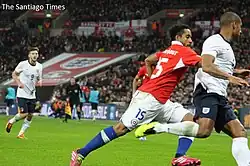 He made his senior debut in a friendly against Mexico in the United States on 18 February 2004, and made the assist for Reinaldo Navia's goal in a 1–1 draw.[67] He played twice more that year, but did not appear again until 2008.[68] His first international goal came on 10 June 2009 in a 4–0 defeat of Bolivia at the Estadio Nacional in a World Cup qualifier.[69]