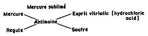 Jean Beguin (1550–1620) was an iatrochemist noted for his 1610 Tyrocinium Chymicum (Begin Chemistry), which many consider to be one of the first chemistry textbooks. In the 1615 edition of his textbook, Beguin made the first-ever chemical equation or rudimentary reaction diagrams, showing the results of reactions in which there are two or more reagents.[1] Modern rendering of this famous diagram, detailing the reaction of corrosive sublimate (HgCl2) with sulfide of antimony (Sb2S3), is shown below:[2]