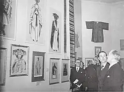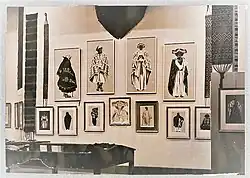 For his illustrated book Costumes du Maroc (1942), he identified three basic categories of costumes: rural Berber dress, Jewish dress and urban citizens' costumes, some of which showing influences from Arab culture.[10] Moreover, each of the portraits of his 60 gouache paintings was attributed to a specific social role (married woman, palace guard, musician etc.), city or region, and Berber dress also assigned to corresponding tribal groups. His artistic portraits on a white background show more women than men (43 and 17 respectively), most of them in elaborate dress that the author found "the most beautiful or at least most representative".[11]