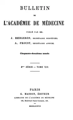 - ^ a b c d Bulletin de l'academie de medicine, v.19–20. W. Wood. 1888. pp. 885–888. Retrieved 2009-03-01.
