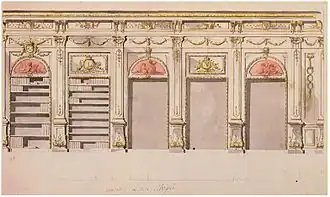 He was heavily employed by the Royal Court as well, doing interior design work for Queen Louisa at Drottningholm Palace. Later, in 1779, he oversaw the changes at Gripsholm Castle and Stockholm Palace, which had been ordered by King Gustav III. He also redecorated parts of the Bollhuset (1772) and designed furniture with Georg Haupt.