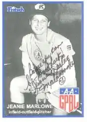 Jean Marlowe [″Mal″ or ″Jeanie″] (December 28, 1929 – April 16, 2007) was a pitcher and utility who played in the All-American Girls Professional Baseball League between the 1948 and 1954 seasons. Listed a 5 ft 6 in (1.68 m), 135 lb., she batted and threw right-handed. Her last name is really Malanoski, but she acquired her last name in the league as a result of a misspelling.[1][2]