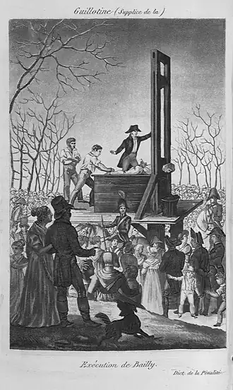In July 1793, Bailly left Nantes to join his friend Pierre-Simon Laplace at Melun, but was recognized there and arrested. On 14 October, he was pressed to testify against Marie Antoinette but refused. On 10 November 1793, he was brought before the Revolutionary Tribunal in Paris, speedily tried, and sentenced to death the next day. On 12 November 1793, he was guillotined at the Champ de Mars, a site selected symbolically as the location of his betrayal of the republican movement. The little red flag he had used to give the order to fire on the crowds on the Champs de Mars was tied to the cart that took him to his death, and burned in front of him before he was executed.[14] It was the revival of this event as a part of republican heritage after 10 August 1792, as well as a campaign of municipal persecution led by Marat, that ultimately resulted in Bailly's execution, as well as that of "many of his colleagues".[13]: 213 Before his death, he was forced to endure the freezing rain and the insults of a howling mob. When a scoffer shouted, "Tu trembles, Bailly?" ("Do you tremble, Bailly?"), he responded, "Oui, mais c'est seulement de froid" ("Yes, but it is only the cold").