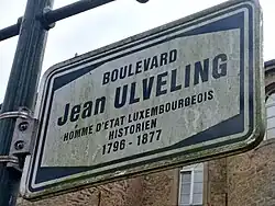 Jean Ulveling (3 April 1796, in Niederwiltz (near Wiltz) – 7 December 1878, in Luxembourg City)[1] was a Luxembourgish statesman, politician, and historian. He served as a member of the Council of State of Luxembourg for some years, and was a member of the Constituent Assembly which framed a new constitution in 1848. From 1854 to 1856 he represented the canton of Wiltz in the Chamber of Deputies.