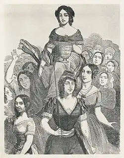 Deroin was a prominent figure during the Revolutions of 1848, campaigning on the rights of women and against the exploitation of children and harsh treatment of convicts.[2] With other Fourierist women such as Pauline Roland, Eugenie Niboyet and Desirée Gay, she launched a socialist feminist newspaper and club, the Voix des Femmes. She led calls for women's suffrage. The group was soon forced to close, but Deroin worked with Gay to found the Association Mutuelle des Femmes and Politique des Femmes newspaper.[1] The organisation gave free courses to working women.[2] Politique des Femmes soon found itself unable to raise a 5,000 franc security bond required by the government.[1] Deroin replaced it with Opinion des Femmes, but this lasted only one issue.[2]