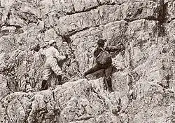 Immink began climbing in the Dolomites shortly after moving to Switzerland. She made her first major climb in 1889 as she ascended a new route on the Ortler in South Tyrol with a guide. The same year, she made the first female ascent of the Antelao.[1] In 1891 she ascended the Schmitt Chimney of Fünffingerspitze in the Langkofel Group, a year after Robert-Hans Schmitt made the first ascent and expressed doubt that the route would ever be climbed again.[2] She climbed an as-yet unnamed and unclimbed mountain in the Dolomites in 1891 which has since been named the Cima Immink.[1] In 1893, German climber and photographer Theodor Wundt asked Immink if she would accompany him on an ascent of the Kleine Zinne (Cima Piccola) of the Tre Cime di Lavaredo; his photographs of her were later published in his book Wanderungen in den Ampezzaner Dolomiten. This would be her final expedition before she retired from climbing in 1894, having sustained an injury from a previous trip.[1]