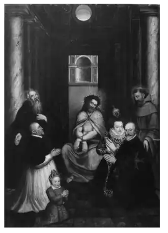 The suffering Christ, Saint Francis and Saint Anthony, surrounded by the donors: Bishop Antoine de Saint-Nectaire, François de Saint-Nectaire, his wife Jeanne de Laval and daughter Hippolyte.