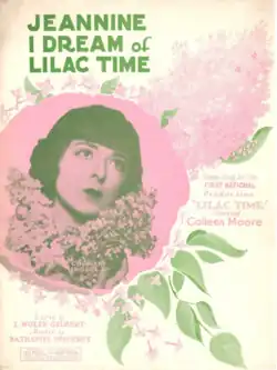 "Jeannine, I Dream of Lilac Time" is a 1928 song composed by Nathaniel Shilkret with lyrics by L. Wolfe Gilbert. It is the theme song of the silent film Lilac Time, starring Gary Cooper and Colleen Moore. The song sold almost two million copies of sheet music and was recorded by over a hundred top artists, including Louis Armstrong, Erroll Garner, Skitch Henderson, Guy Lombardo, The London Philharmonic Orchestra, John McCormack, Mitch Miller, Hugo Montenegro, The Platters, and Lawrence Welk.[5]