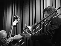 By 2000 or so, he was focusing exclusively on trombone and formed his own trio, the Jeb Bishop Trio, with Vandermark Five cohorts bassist Kent Kessler and drummer Tim Mulvenna.[3] The trio has two CDs on OkkaDisk, the second with guest guitarist Jeff Parker.