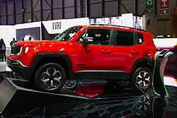 The Jeep Renegade is a subcompact crossover SUV produced by Stellantis under their Jeep marque.[7] It was first shown to the public in March 2014 at the Geneva Motor Show and production started in late August of that year. The Renegade was the smallest vehicle currently marketed by Jeep, until the arrival of the Avenger. It slots between the Avenger and the Compass. It is based on the FCA Small Wide 4×4 platform which is also shared with other FCA models, including from Fiat and Alfa Romeo brands.