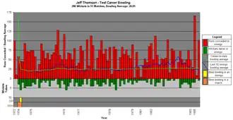 Thomson had an unusual but highly effective slinging delivery action that he learned from his father. In December 1975, after the second Test match against the West Indies at the WACA, he was timed with a release speed of 160.45 km/h using accurate, high-speed photo-sonic cameras. The study was carried out by Tom Penrose and Brian Blanksby of the University of Western Australia, and Daryl Foster of the Secondary Teachers' College in Perth. Measurements were also made of three other fast bowlers, Dennis Lillee, Andy Roberts and Michael Holding.[5][6][7][8] Thomson's fastest delivery was the quickest, with Roberts second with a delivery measured at 150.67 km/h.[9] In 1979, Thomson won a fastest-bowling competition held by the Australian television station Channel 9, in a year in which he was banned from playing professional cricket due to striking a soccer referee.[10][11] His maximum speed was measured at 147.9 km/h using the same method as employed during the 1975 study at the WACA. (Incidentally, a follow-up study in 1976 put him at 160.6 km/h—he was the fastest of those tested in both studies.)[12] He also won the accuracy prize in the competition.[13] Four decades on, Thomson mentioned in an episode of Cricket Legends that he had intentionally bowled full tosses for the competition in order to improve his score. There was a $5,000 cash prize for the fastest bowler, and there was an additional $5,000 for the most accurate bowler (three points for the middle stump, and one point for either leg stump or off stump); Thomson scooped the entire $10,000 prize pool (approximately $50,000 in 2022 terms).