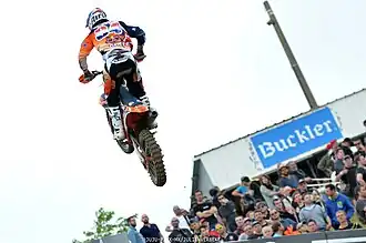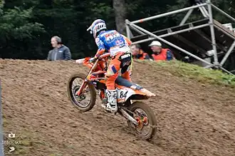 Jeffrey Herlings[1] (born 12 September 1994) is a Dutch professional motocross racer.[2] He has competed in the Motocross World Championships since 2010. Herlings is notable for winning the 2012, 2013, and 2016 MX2 Championships; and the 2018, 2021 MXGP Championships.[3] He has the most Grand Prix wins in MXGP history.