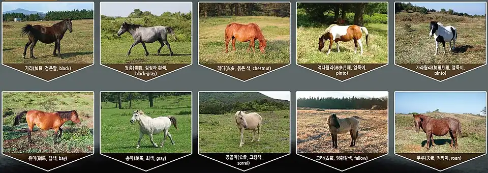 - Geoheulma (거흘마, spotted): The colors around its eyes, lower abdomen, and legs are lighter or whiter than that of the entire coat.
