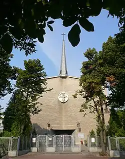 Jelonki Południowe is a residential area with mixed low-rise single-family and mid- and high-rise multifamily housing. To the south of Czułchowska, it includes the neighbourhoods of Stare Jelonki and Nowy Chrzanów with detached and semi-detached houses.[3][1][26] They are bordered by housing estates of Lazurowa to the west of Drzeworytników Street, and Jelonki to the east of Drzeworytników and Brygadzistów Streets, composed of the high-rise apartment buildings, mostly dating to the 1970s.[3][23] Among historic and notable buildings, Jelonki Południowe also includes the Schneider Villa, a wooden villa at 9 Połczyńska Street, dating to 1902, which used to be the residence of the Schneider family, which owned the settlement in the 19th and early 20th centuries.[1] Currently, it houses the Warsaw Wola Pentecostal Church.[24] The neighbourhood aslo includes the Church of the Exaltation of the Holy Cross at 31 Brygadzistów Street, belonging to the Catholic denomination.[20][21]