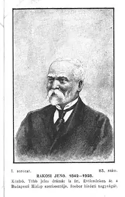 Jenő Rákosi (born Jenő Kremsner; 12 November 1842, Acsád, Kingdom of Hungary – 8 February 1929, Budapest, Hungary) was a Hungarian writer, journalist, theater director, editor, and a member of Hungarian Academy of Sciences and Kisfaludy Society and a member of the Petőfi Association.