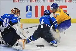 ![]() Hiirikoski (center) representing Finland at the 2011 IIHF World Championship | |||