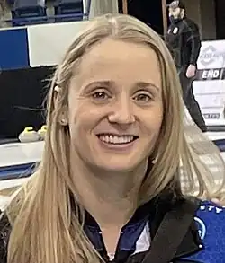 Entering the 2017 Canadian Olympic Curling Trials, Team Jones was the top ranked Canadian women's team and looked to defend their trials title from 2013.[155] Jones, with teammates Lawes, Officer and McEwen had a perfect start to the week, winning their first five games to lead the round robin pool. In their sixth game, they faced co-leader Chelsea Carey and suffered their first loss 7–5.[156] They also lost their next two games to Krista McCarville and Rachel Homan, finishing the round robin with a 5–3 record. This was good enough to advance to the semifinals where they again faced Team Homan. Chasing the entire game, the team suffered their fourth straight loss and were eliminated from the event in third place.[157] Despite this, Jones had another chance to qualify for the Games through the 2018 Canadian Mixed Doubles Curling Olympic Trials. As her regular partner Brent Laing won the men's trials with Kevin Koe, Mark Nichols slotted in as Jones' partner for the Olympic run.[158] The pair gelled well immediately, finishing 8–3 through the round robin and championship rounds to reach the final four. Ultimately, their run came to an end in the 3 vs. 4 page playoff game with a 5–4 loss to Jocelyn Peterman and Brett Gallant.[159] In the final, Jones' third Kaitlyn Lawes won the event with partner John Morris.[160]