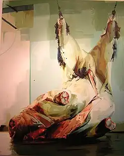 Since her debut in 1992, Saville's focus has remained on the female body. She has stated, "I'm drawn to bodies that emanate a sort of state of in-betweenness: hermaphrodite, a transvestite, a carcass, a half-alive/half-dead head."[11] In 1994, Saville spent many hours observing plastic surgery operations in New York City.[12] Her published sketches and documents include surgical photographs of liposuction, trauma victims, deformity correction, disease states and transgender patients.[13] Much of her work features distorted flesh, high-calibre brush strokes, and patches of oil colour, while others reveal the surgeon's mark of a plastic surgery operation or white "target" rings. Her paintings are usually much larger than life-size, usually six by six feet (1.8 by 1.8 m) or more.[14] They are strongly pigmented and give a highly sensual impression of the surface of the skin as well as the mass of the body. Saville's post-painterly style[15] has been compared to that of Lucian Freud[16] and Rubens.