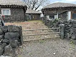 ![]() Jeongnang gate at Chusagwan, the home of poet Kim Jeong-hui when he lived in exile in Jeju. The lowered poles indicate that the owner of the house is at home. (2022) | |