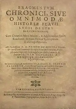 In 1594, Higuera claimed to have in his possession four chronicles thought to be lost. These works, attributed to Flavius Lucius Dexter, Maximus of Zaragoza, Liutprand of Cremona and Julián Pérez, were in fact forged by Higuera. They are known as the false chronicles in Iberian historiography.[8] The chronicle of pseudo-Dexter covers the years 1–430.[9] That of pseudo-Maximus covers the period 430–620.[10] The chronicle attributed to Luitprand (as Higuera spelled it) he originally attributed to one Eutrand. It covers the period from the seventh to the tenth century.[11] Although his first three forgeries were attributed to historical authors, the fourth Higuera attributed to an author of his own invention, a Mozarab named Julián Pérez, whom he presented as a contemporary of El Cid (d. 1099).[12]