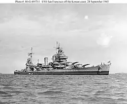 Rear Admiral Jerauld Wright took command of Cruiser Division Six (CruDiv 6), with USS San Francisco, a New Orleans-class cruiser, serving as his flagship. In early October 1945, CruDiv 6 was assigned to assist the post-surrender activities and general-purpose peace-keeping duties throughout the Yellow Sea and Gulf of Bohai region as a unit of the U.S. Seventh Fleet under the command of Vice Admiral Thomas C. Kinkaid. Wright's force showed the flag, making port visits at Tianjin, Qingdao, Port Arthur, and Qinhuangdao. At the final port call at Jinsen, Wright acted as the senior-ranking member of the committee that accepted the surrender of Japanese naval forces throughout Korea.[74]