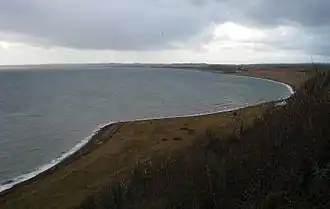 The coastal hill Jernhatten is exposed to the sun, and at the same time located in the driest part of Denmark. This gives a microclimate that favors vegetation with similarities to what can be seen in South-Eastern Europe. At the wind exposed top of the hill there is stunted beech tree growth with anemone, ivy, and wild apple trees. The northern and eastern part of the hill merges into a common, maintained through grazing, with primrose blossom in spring.[2] At the foot of the hill lies an elevated beach plain resulting from land uplift due to release of pressure when the heavy ice sheet covering large parts of Denmark melted away 10.000 years ago at the end of the last ice-age.