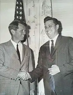![]() Schutzer (right) campaigning with Robert F. Kennedy (left) | |