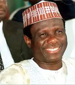 He was elected Senator in 1983, serving briefly until the military coup that brought General Muhammadu Buhari to power. He was appointed chairman of Mass Mobilisation for Social and Economic Recovery under General Ibrahim Babangida's government. He subsequently became a cabinet minister for Agriculture and Natural Resources, Information and Culture, Cooperation and Integration in Africa and again for Information and National Orientation.[3][6]