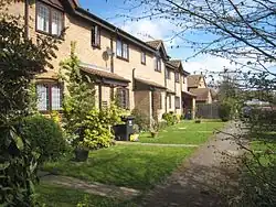The area was converted from cultivated fields into a residential estate in the 1970s, and as such many of the properties are more modern than in the city centre. Local amenities include a pub, small shops and a community centre. It was named after the local farm house which sat close to the current shops. This name was not that old as it changed in the 60s; before that it was known as Evans farm. Its elevations range from 110 metres in the north-west to 77 metres above sea level in the south-east just above a source of a small tributary of the Colne.