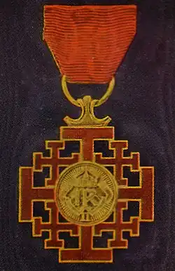 The Jerusalem Cross is made in the shape of the Jerusalem cross. The cross consists of a large cross portent with four plain crosslets between the arms. The crosses are red enameled with silver-gilt borders. In the center of the cross is a round gold colored medallion.[2]