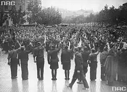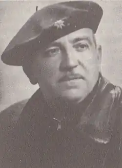 Following the seizure of Zaragoza Comín played a politically vital role, transforming the Aragon insurgency from defense of the Republic against anarchy, as Cabanellas would have had it, into a monarchist, ultra-conservative and fanatically Catholic crusade.[90] Under his command the Carlists were tearing down republican flags and replacing them with monarchist banners; he personally introduced Virgen del Pilar painting into the ayuntamiento hall,[91] while the city elated in religious celebrations.[92] Comín threw himself into organizing the new Requeté battalions; in late July the first sub-units of Tercio de Nuestra Señora del Pilar were formed,[93] later on followed by another Aragon battalion, Tercio de los Almogávares.[94] In the autumn Comín was incorporated into command structures of the Pilar tercio, though given his lack of military training it is not clear what exactly his position was.[95] He spent December 1936 in line on the Madrid front,[96] though it is not known what was his unit at the time;[97] also later on he served in the frontline troops on the on and off basis, present among soldiers entering Teruel when re-taken by the Nationalists in early 1938.[98] He suffered combat wounds;[99] noted for demonstrating bravery which bordered imprudence, Comín was admonished for taking unnecessary risks.[100]
