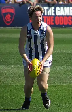Even while a member of the Australian cricket team, Duffin occasionally played football with various clubs including Melbourne University, Wyndhamvale and St Kilda Sharks.[64][65] In October 2015, she decided to take an indefinite break from cricket,[30] later revealing this was partly prompted by her interest in the AFL's soon-to-be-launched women's football league: "I got wind of the AFLW coming in... that's when I had to consider playing football and not playing cricket for Australia."[3] After playing with her sister at Port Melbourne Colts in Division 4 of the Victorian Women's Football League, Duffin accepted an invitation to join Premier Division VWFL team Diamond Creek.[64] In April 2016, she kicked nine goals on debut for the club.[66]