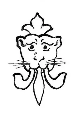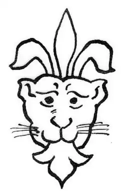 Charles Boutell (1863)[2] described the charge thus: "A leopard's face affrontée, resting upon a fleur-de-lys, and having the lower part of the flower issuing from the animal's mouth". This appears to describe a fleur-de-lys erect. The fleur-de-lys is on occasion shown reversed, perhaps as an heraldic difference, or simply in error.[3] The early authority on heraldry John Guillim (d.1621) wrote in his Display of Heraldry: "A Lyon Jessant..is not subjected to the primary charge, but is borne over both the field and charge, and is therefore called a Lyon Jessant, jacendo, because of such lying all over". (i.e. French, from jacendus-a-um the gerundive of the Latin verb jaceo, to lie[4]). Guillim may have given some thought to this charge, having married a member of the Denys family of Gloucestershire, whose arms display the charges three times.