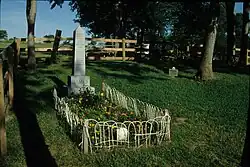 James' original grave was on his family property, but he was later moved to a cemetery in Kearney. The original footstone is still there, although the family has replaced the headstone. James' mother Zerelda Samuel wrote the following epitaph for him: "In Loving Memory of my Beloved Son, Murdered by a Traitor and Coward Whose Name is not Worthy to Appear Here."[54] James' widow Zerelda Mimms James died alone and in poverty.