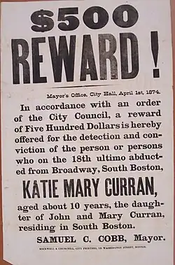 In March 1874, a 10-year-old girl from South Boston named Katie Curran went missing. On April 22, 1874, the mutilated body of a 4-year-old boy named Horace Millen was found on the marsh of Dorchester Bay. Immediately, the police detectives sought out Pomeroy, despite lacking evidence implicating him in the crime. The body of Katie Curran was found later, in the basement of Pomeroy's mother's dress shop. Her remains were hastily and carelessly concealed in an ash heap.[2]