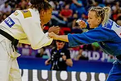 Jessica Klimkait (born 31 December 1996) is a Canadian Judoka who competes in the women's 57 kg category.[3] In 2021 she became Canada's second judo world champion, defeating Momo Tamaoki of Japan in the women's lightweight (57 kg) final at the championships in Budapest, Hungary; the win also qualified her for the Tokyo Olympic Games.[4] She won one of the bronze medals in the women's 57 kg event at the 2020 Summer Olympics.[5]
