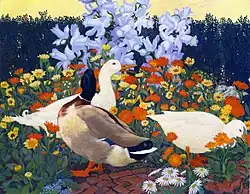 Inspired by early work as a designer of woven tapestries, Botke's art often featured birds, particularly white peacocks, geese and cockatoos.[8] Later in her career, she moved from oils to watercolors, and also focused on still lives.