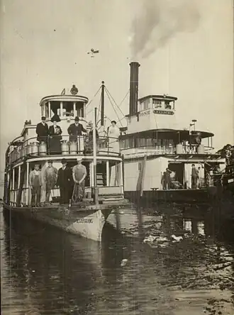 On May 6, 1904, it was announced that Jessie Harkins would be put on a route running on the lower Willamette river from Portland to St. Johns, Oregon.[7] The boat made six round trips a day, leaving the Washington Street dock in Portland at 7:00, 8:30 and 10:30 a.m, and 1:00, 2:30 and 4:00 p.m.[7] The downstream run took 30 minutes.[7] The fare was five cents to the dry dock on the Willamette River and 10 cents to Linnton further downstream.[7]